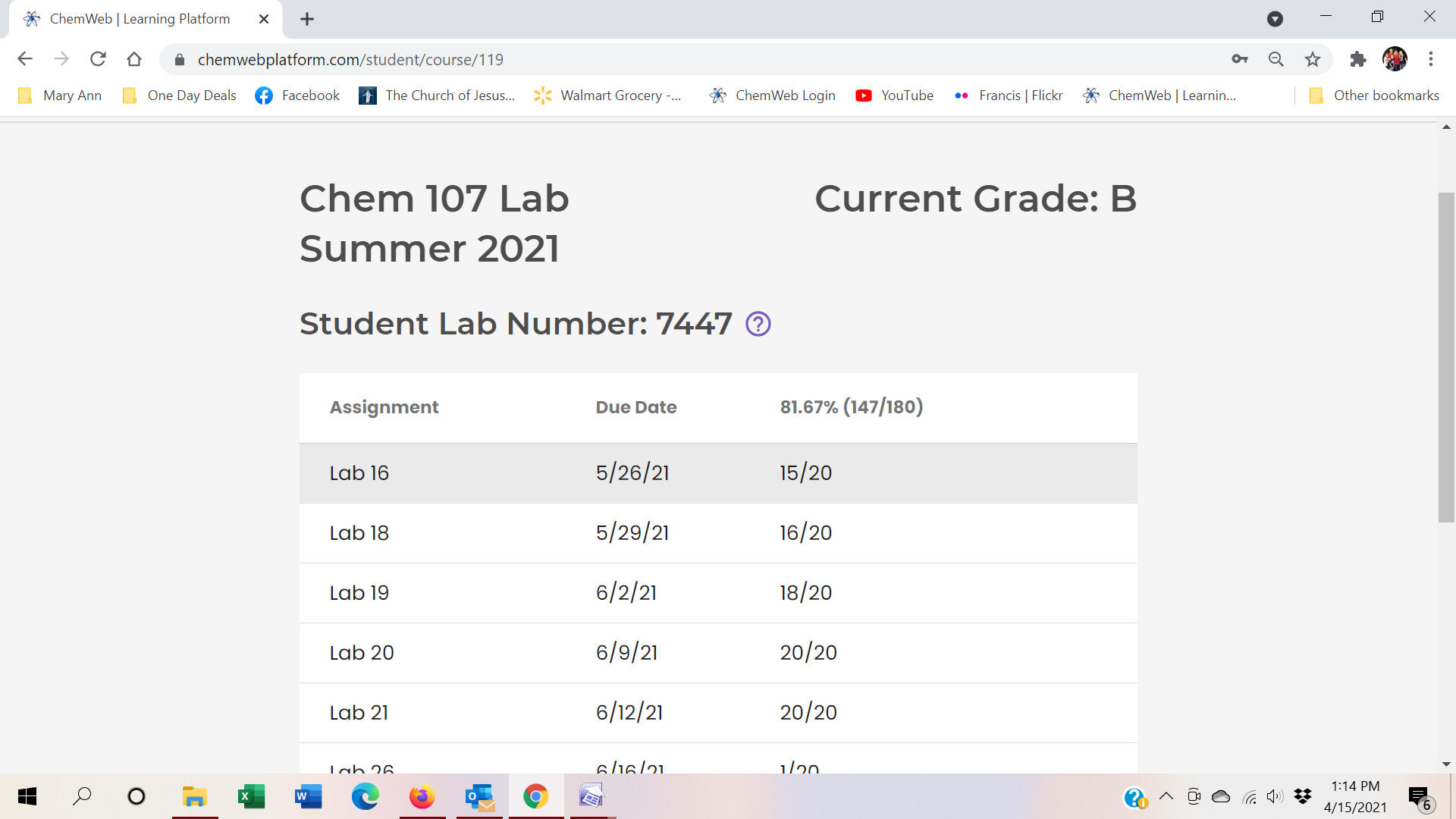 1. Once you are logged into ChemWeb, you should see your gradebook similar to the picture below. Note: Your student lab # is listed right above the "assignment" column. This is your "unknown #".